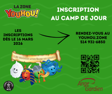 La municipalité d'Ange-Gardien offre une aide financière de 50% pour les frais de sorties du camps de jour Youhou. Les parents doivent inscrire leurs enfants séparément et fournir les reçus des activités.