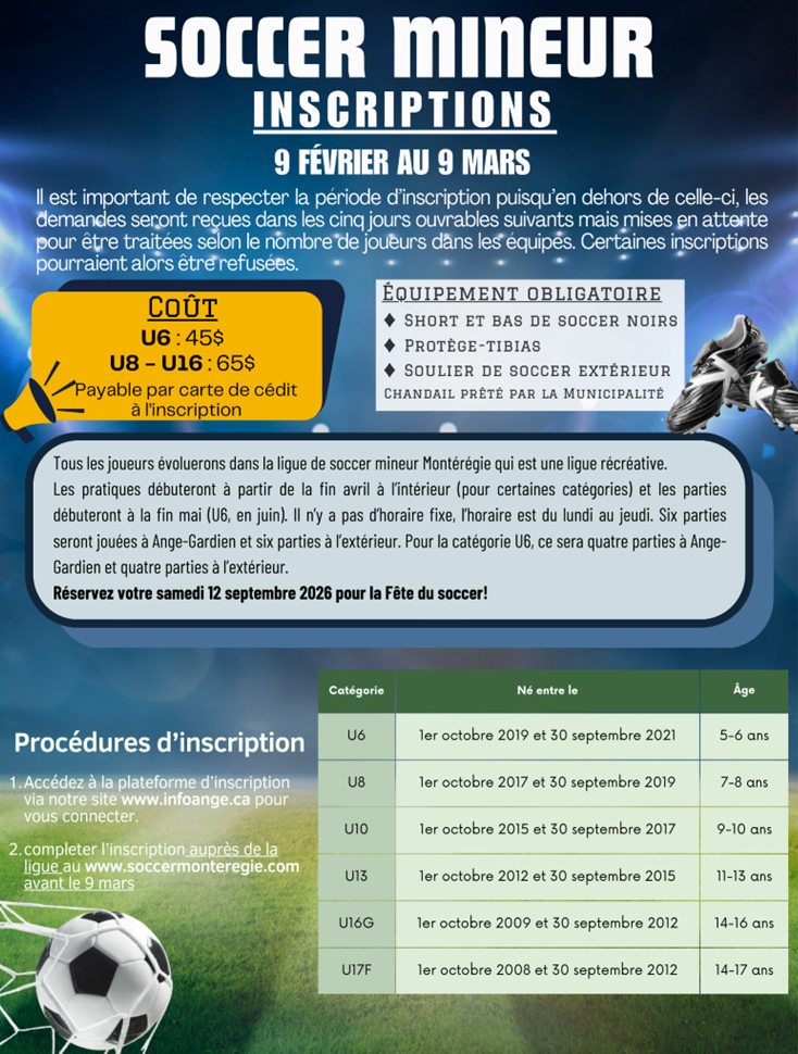 Si vous avez manqué la période d'inscriptions, veuillez contacter Mme Jennie Rainville au j.rainville@municipalite.ange-gardien.qc.ca
